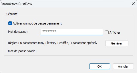 Comment activer le mot de passe permanent ?Dans la fenêtre Paramètres RustDesk :