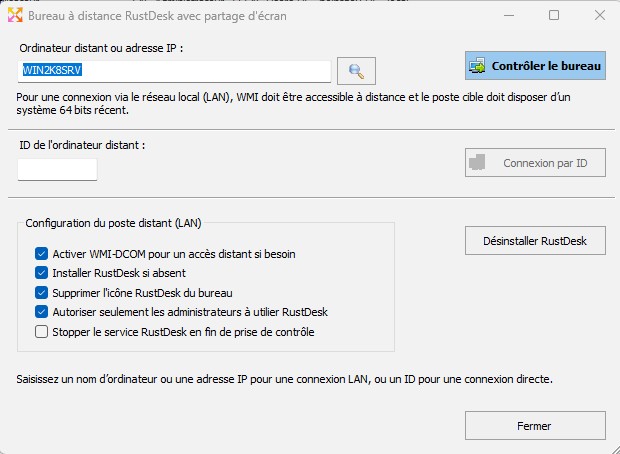 Les tâches sont exécutées dans un thread indépendant afin de ne jamais bloquer l’application. ➡️ RustDesk est-il obligatoire ?Non. RustDesk est une option supplémentaire. Les administrateurs peuvent continuer à utiliser :