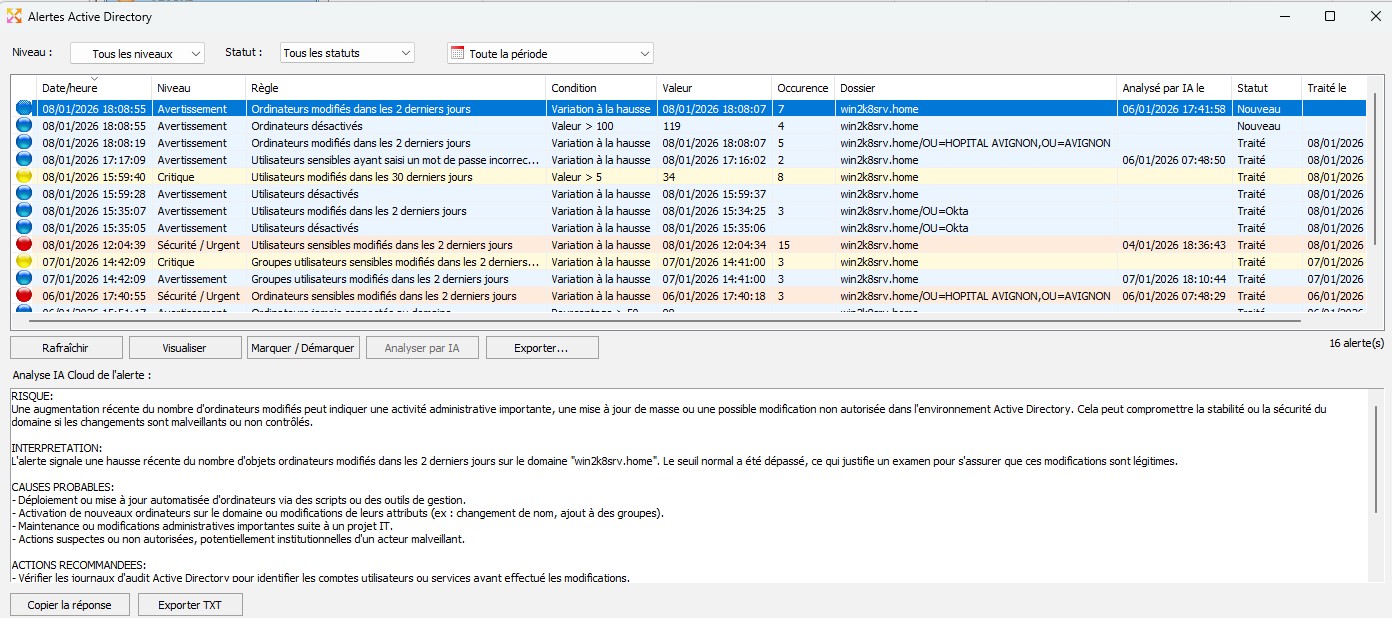 - Alertes Active Directory en temps réel, avec analyse possible par IA Cloud (Faq)