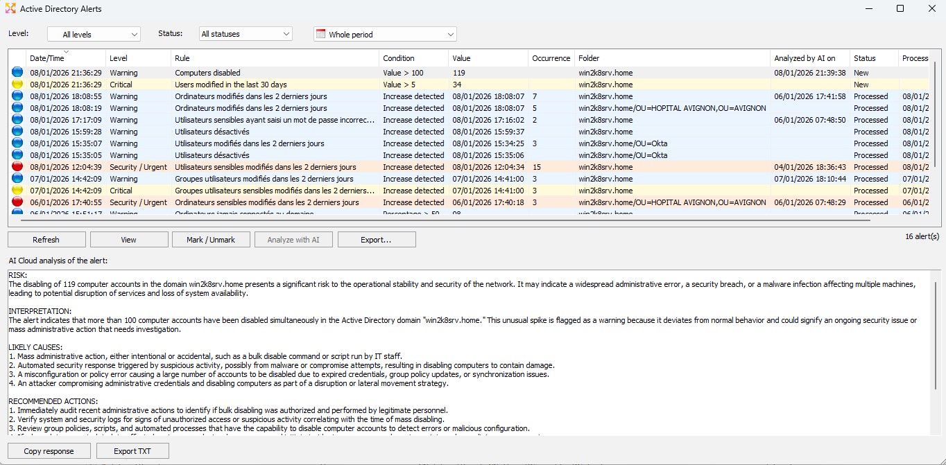 A major new feature in version 26: automatic alert analysis using artificial intelligence. Each alert can be automatically interpreted to assess the actual risk level, identify probable causes, and suggest concrete actions tailored to Active Directory environments. The administrator thus benefits from a clear, structured, and immediately actionable report.